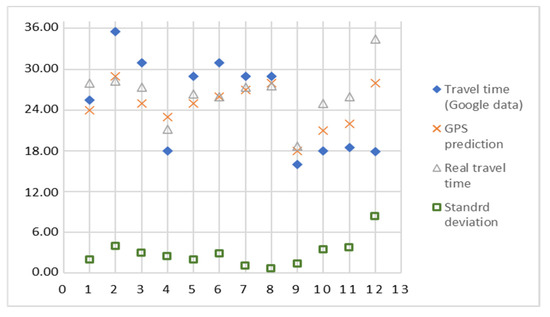 The presented sample data contains driving routes at different times of the day and week, where the real-time data were automatically collected by two UAVs. We observed differences in the prediction errors of the Google data depending on the number of vehicles and the distance. The obtained data varied depending on the specific day (communication peak or holidays) from 16 to 35 min. The standard deviation between the results for subsequent days took values from 0.70 to 8.36. The differences were quite low (except on the last day) but still relevant for enhancing the algorithms and optimizing their sensitivity. The different density of vehicles on the streets, despite the survey being completed during the same hours, was due to working days and holidays (measurements 4 and 9). The largest variances occurred during peak hours of working days and before upcoming holidays (measurements 2 and 12). This study compared different heterogeneous data and identified reasons for the variances. Overall, the automatic measurement using two UAVs shows that it is necessary to include a correction for travel time predictions when using third-party algorithms.
