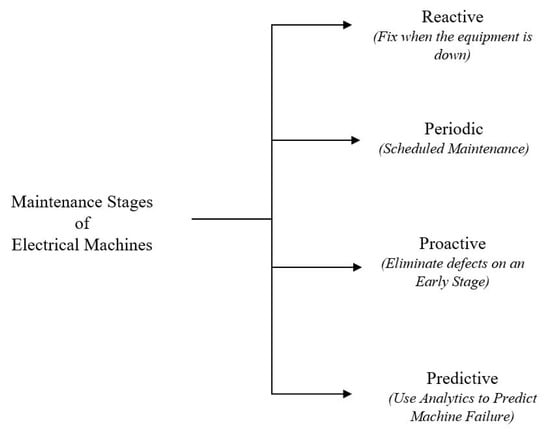 This advancement has helped the industry to switch from scheduled maintenance towards predictive maintenance and real-time condition monitoring of electrical machines. Condition monitoring of electrical machines is now a standard implementation in any modern industry [14,15]. Data collection for further data analysis is a core part of this system that helps develop predictive maintenance systems [10,16]. In general, electrical machine maintenance can be divided into four phases: periodic, proactive, reactive, and predictive maintenance. Most of the industry still works with periodic and reactive maintenance, i.e., scheduled maintenance or when a machine is down, as shown in Figure 1. There is an uptrend to move towards proactive and predictive maintenance as it is more cost-efficient and productive. This move is mainly possible because of the recent development in the field of IoT and research on the development of more accurate machine learning-trained models for electrical machines with high-quality data collected with the help of condition monitoring systems.