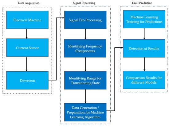 Much work is being done on the condition monitoring of electrical machines [12] and fault detection [44] in electrical machines and bearings [45,46]. However, not much work is being done in the field of fault prediction in electrical machines. Some researchers are working in this domain, but some are utilizing the time domain while other systems are still being developed or are primarily for offline analysis and diagnostics [16,47]. Some of the other systems used in this domain only utilize fault detection while gathering data for training, or there are some commercialized products available. However, they are not only expensive, but their technology is still not disclosed.