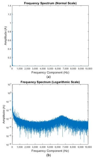 The first step is to process the gathered data and make it suitable for training. The data gathered through Dewetron are in the time domain, which is converted into the frequency domain using Fast Fourier Transform (FFT). The approach taken here is considering the current signature of the electrical machines and the effect of faults on them. A comparison between the entire frequency spectrum of both healthy and faulty cases is shown in Figure 4a. The spectrum is also shown in the logarithmic scale in Figure 4b for better understanding.