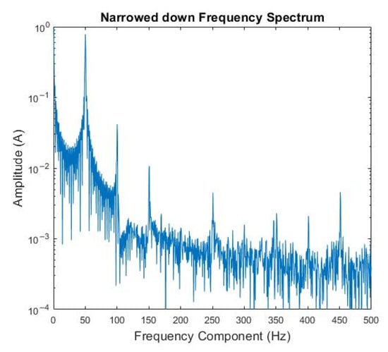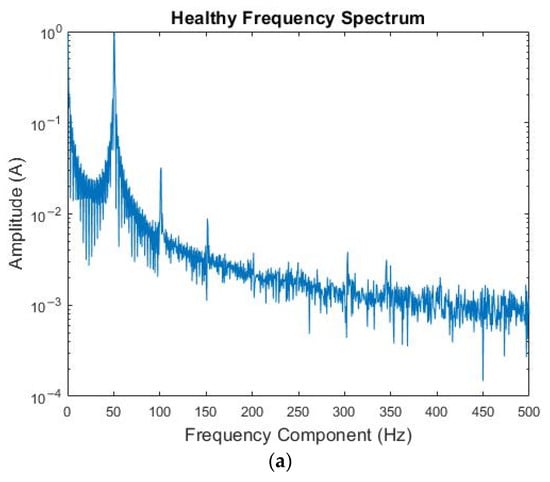 The data are then further processed to check the amplitude of these frequency components in healthy and faulty cases. This process is carried out for multiple samples from different induction machines so that the identified components are universal for this specific fault. All amplitudes are normalized to lie between the range of 0–1 to get consistent results. Figure 7 shows an example of a frequency spectrum for both healthy and faulty cases with frequency components and amplitudes.