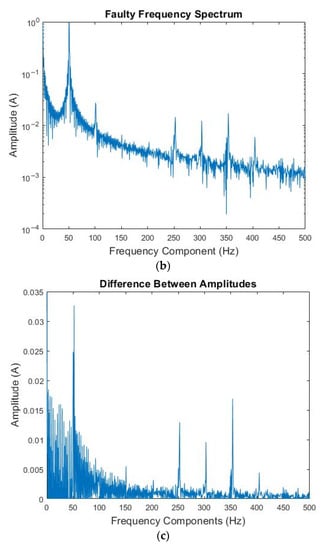 Frequency spectrum (a) healthy case, (b) faulty case, (c) difference to identify frequency components.