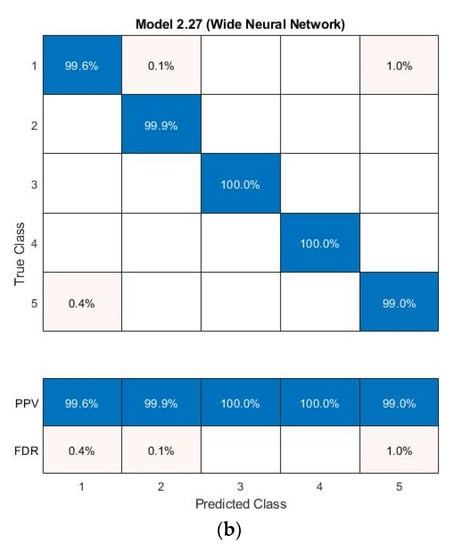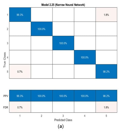 Machine learning models were trained based on blind validation, i.e., the samples used for validation were not used for the training of the models. A total of eight models were considered, with the majority from neural networks for classification. A comprehensive comparison between the accuracies of these models is given in Table 7. The confusion matrix for the validation results of the two models is shown in Figure 10.