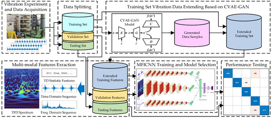 Figure 2 is the framework of the CVG-MFICNN method proposed in this paper. First, a 1-D (one-dimensional) CVAE-GAN model is trained based on the vibration data samples of the training set to produce generated samples. The generated and original training samples are combined to form an extended training set. Second, the time-frequency spectrum, time-domain vibration sequence, frequency spectrum sequence, and time-domain statistics of vibration signals are extracted. The extended training feature set, validation feature set and testing feature set are formed based on the above features. Then, the extended training feature set is used to train the MFICNN model, and the validation feature set is used to select the model with the best validation accuracy during the total training process. After training and validation, a model can be obtained without overfitting or underfitting. Finally, the performance of the selected model is tested using the testing feature set to evaluate the effectiveness of the proposed method.