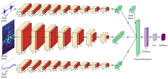 Conventional convolutional neural network models cannot process multiple types of input features, such as images and sequences, simultaneously. In this paper, an MFICNN model structure is designed which can fuse and process multiple types of input features. The model structure is shown in Figure 5. In the figure, TFDS, TDS, FDS, and TDF represent the time-frequency spectrum, time-domain sequence, frequency-domain sequence, and time-domain statistical value code, respectively.