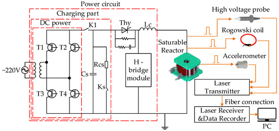 Figure 6 shows the vibration experiment wiring diagram. An AC power with a voltage of 220 V is used and connected to a DC power via a transformer. The DC power mainly consists of four sets of IGBTs and is used to charge capacitor Cs. The capacitor Cs is connected to the DC power through switch K1, grounded through grounding resistance Rcs and switch Ks. Ks ensures that capacitor Cs is reliably grounded when the experiment is not running. A thyristor valve Thy is set to control the energy supplement for the H-bridge module. Isolation transformers and series reactors are arranged in the H-bridge module cabinet to supply energy for IGBT drivers. The H-bridge module rectifies the DC voltage for the saturable reactor. The voltage peak value is adjusted by connecting the equivalent stray capacitor to simulate the operating conditions of the saturable reactor. The excitation can simulate the two pulse voltages generated at the moment of opening and closing the UHVDC thyristor valve. The current passing through the saturable reactor is approximately trapezoidal. The voltage and the current waveform are consistent with the actual engineering waveform. Therefore, the operating vibration characteristics of the saturated reactor can be well simulated by conducting this vibration experiment.