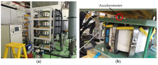 Saturable reactor vibration experiment: (a) experimental field; (b) saturable reactor appearance and installation of the accelerometer.