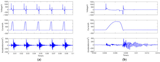 Figure 8 shows the saturable reactor’s voltage, current, and vibration data with the iron core in the normal state (NS) and a peak current of 1280 A. Figure 8a represents the time domain waveform of voltage, current, and vibration acceleration of five consecutive cycles, and Figure 8b represents the first valve opening and closing process in Figure 8a. Saturable reactor vibration is caused by current change, so the macro period of vibration is also 50 Hz, which is the same as that of the current. In the process of single valve opening and closing, the vibration excitation of a saturated reactor caused by current change and magnetostriction is similar to two consecutive shocks with a certain time interval. Due to the higher current change rate di/dt during the closing process, the corresponding shock excitation is stronger, and the resulting vibration response is more intense than the opening process.