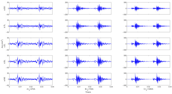The vibration experiment is conducted under different peak currents to collect vibration data of saturable reactors with iron core looseness faults of various levels. Specific experimental parameters are shown in Table 4. In the table, a, b, c, d, and e represent five levels of iron core looseness faults.