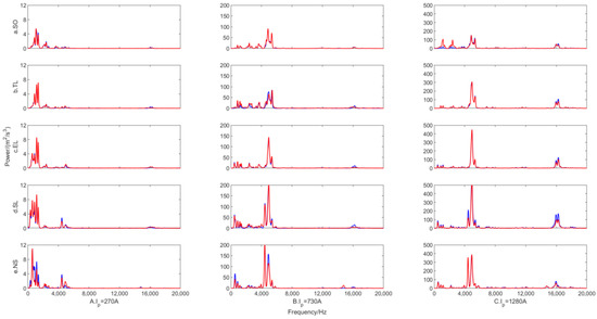 Power spectra of the original and generated samples. The blue line represents the real sample, and the red line represents the generated sample. From top to bottom, a~e represent the five iron core looseness faults in Table 4. From left to right, A, B, and C represent that the current peak values are 270 A, 730 A, and 1280 A, respectively.
