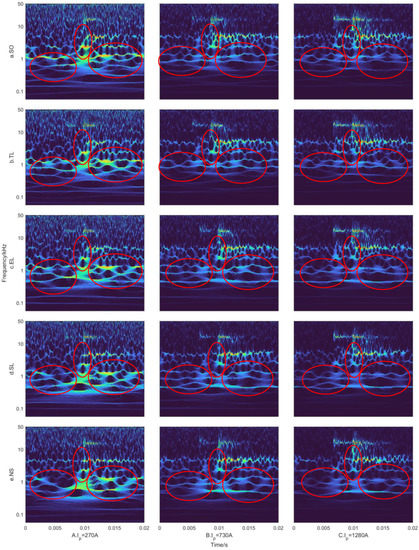 Figure 11 shows the SST time-frequency spectrum features of saturable reactors with different fault states operating under different loads. It can be seen from the figure that both the operating condition and fault state affect the color and shape of the internal vortices in the time-frequency spectrum. With increasing load, the concentration degree of the signal in the frequency domain increases, and the difference between the hot spot area and the background area of the time-frequency spectrum increases as well. However, both the overall brightness of the image and the proportion of red, yellow, and green areas decrease. By comparing the time-frequency spectra of different fault samples under the same operating conditions, we find that the color distribution position and the shape, number, and position of the internal vortices all vary. The time-frequency spectrum in the areas circled by the red solid ovals change significantly. In general, the time-frequency spectra of different faulty samples under different operating conditions are quite different, which can be roughly distinguished by human eyes and used as input of CNN for fault classification.