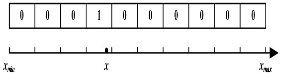 Four time-domain statistics, the peak value, peak-peak value, root mean square value, and peak factor, are added as value features to retain the absolute value information of vibration signals, as the above three features are all normalized before being input into the neural network. These features are processed into structured code using the one-hot method. In this case, each feature is converted into a code with a length of 10. We divided the distribution range of features in the dataset into ten sections at equal intervals and set the code value at the same position as the section where the feature is located as 1, and the other 9 code values are set as 0, as shown in Figure 12.
