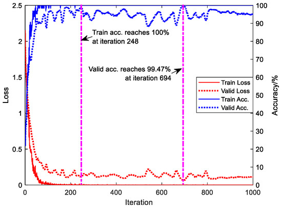 The MFICNN model is trained using the imbalanced training set I~V and the corresponding CVAE-GAN extended training sets. The Adam optimizer is used for model training. The learning rate is set to 0.0005, the maximum number of iterations is set to 1000, the number of small batch samples is set to 64, and the single training model selection strategy is set as selecting the model with the best validation loss. Figure 13 shows the model training process using the CVG-MFICNN method based on training set I. The solid blue line represents the training accuracy, the dotted blue line represents the validation accuracy, the solid red line represents the training loss, and the dotted red line represents the validation loss. In the early stage, the model’s accuracy continues to rise with the increase in training iterations. At 248 iterations, the training accuracy reached 100% and remained almost unchanged. The validation accuracy exceeded 95% but still fluctuated with the increase in iterations. The changing trend of the loss and the accuracy rate is the opposite. After 694 iterations, the accuracy of model validation reached the maximum value of 99.47%, and the validation loss reached the minimum value. After that, the accuracy and loss of model validation continued to fluctuate, but it could not obtain better validation performance than the model of iteration 694, which indicates that the model was overfitted after 694 iterations. Therefore, the model corresponding to iteration 694 is selected as the final model obtained from this training process and then used for performance testing.