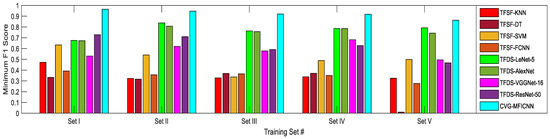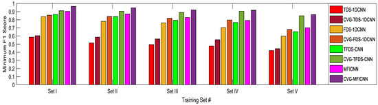 Comparison of minimum testing F1 scores of models trained using the proposed CVG-MFICNN method and existing methods based on different training sets.