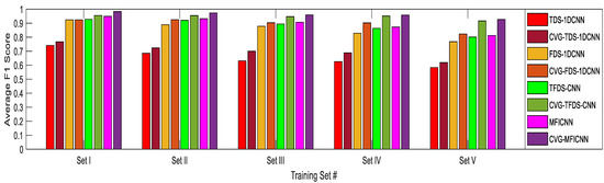 Compared to the other two single-feature methods, the TDS-1DCNN method has the worst performance. The performance of the FDS-1DCNN method is better than that of the TDS-1DCNN method. Combined with CVAE-GAN data extension, the average F1 score of the CVG-FDS-1DCNN method on datasets I~IV exceeds 0.900, which is significantly better than that of the TDS-1DCNN and CVG-TDS-1DCNN methods. The TFDS-CNN method has the best performance. Combined with CVAE-GAN data extension, the average F1 score of the CVG-TFDS-CNN method on all datasets exceeds 0.900, especially on datasets I~IV, and the average F1 score is close to or exceeds 0.950.