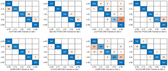 Testing confusion charts of models trained using the TFDS-CNN, CVG-TFDS-CNN, MFICNN, and CVG-MFICNN methods based on training sets I and V.