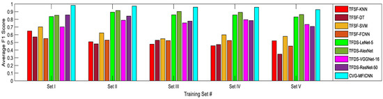 Comparison of average testing F1 scores of models trained using the proposed CVG-MFICNN method and existing methods based on different training sets.