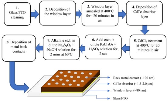 In order to support the new researchers entering this field, the main stages of fabrication of a typical CdS/CdTe solar cell are summarised in Figure 1. The substrate used for the device is commercially available glass/FTO (fluorine-doped tin oxide) with a sheet resistance of 7 Ω/square and the first stage is to thoroughly clean the surface using soap, water, acetone, methanol and high purity water. The second stage is the deposition of the CdS window layer by either chemical bath deposition (CBD) or electroplating. Researchers have also used other methods, such as sputtering, to deposit the CdS layer, and its thickness is in the range 50 nm to 100 nm. This layer requires annealing in air at 400 °C for ~20 min. After cleaning the CdS surface using an alkaline etch to remove any oxides formed during heat treatment, the CdTe absorber layer is deposited. The thickness of the CdTe layer depends on the growth method used; electrodeposition results in a layer thickness of ~1.5–2.0 µm, while the CSS method results in a layer thickness in the range of ~3.0–8.0 µm. This layer then undergoes a heat treatment in air at ~420 °C for ~20 min in the presence of CdCl2; this is the so-called CdCl2 treatment. The resultant surface then undergoes thorough washing in clean water to remove traces of CdCl2, and a suitable chemical etching prior to metallisation. Figure 1 shows the chemical etching used in our labs, and this process creates a Cd-rich CdTe surface. There are other chemical etchants, such as the NP etch (nitric acid & phosphoric acid) also used by other research groups. Back metal contact is usually Au or Ni with a trace of Cu or Sb to enhance the initial efficiency of the device. The specification of the device with typical material layer thicknesses used in electroplating are also included in Figure 1.