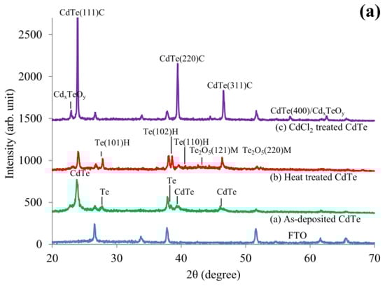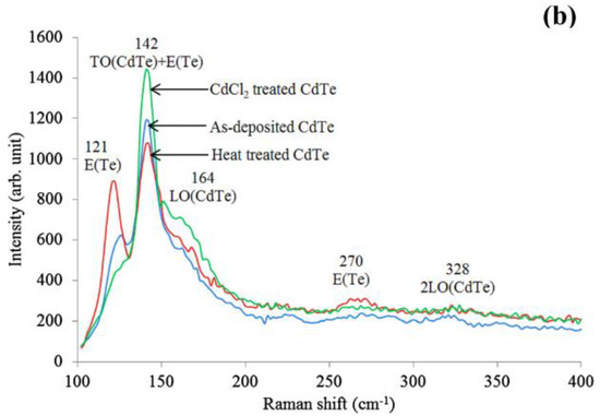 Whatever the growth technique used for CdTe, it has been reported that the layers suffer from Te-richness. Te also tends to precipitate within CdTe, impacting the stoichiometry. This is an inherent problem with CdTe material, irrespective of the growth technique [18]. Recent XRD and Raman work, as shown in Figure 3, indicates the presence of Te in the as-deposited material and the removal of the excess Te during CdCl2 treatment [19]. Added Cd from CdCl2 reacts with precipitated Te to form CdTe during this heat treatment, improving the stoichiometry and moving the material towards Cd-richness, thus making the material more suitable for device fabrication (see Section 2.6). In addition, XRD shows the improvement of the crystallinity of the material.