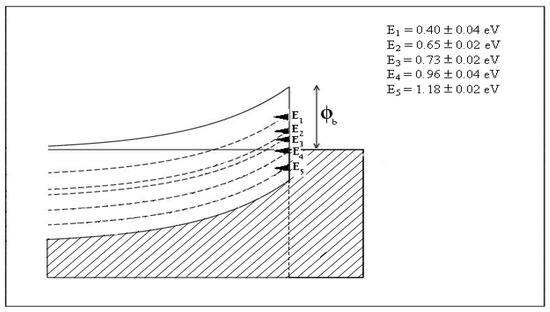 Electrical contacts to n-CdTe surfaces show a complex nature, with Fermi level pinning occurring at five main defect states. These five potential barriers measured using I–V technique are listed in Figure 6 with their error margins and coincide with the defect levels explored using methods like photoluminescence (PL), deep level transient spectroscopy (DLTS) and ballistic electron emission microscopy (BEEM) [29,30,31]. Fermi level pinning position depends on the nature of the material growth and the surface preparation prior to metallisation.