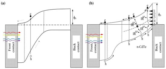 When the CdTe grown is n-type, the situation is very different. Because of the bandgap difference between CdS and CdTe, a weak but rectifying n-n hetero-junction forms. At higher-temperature growth and processing, intermixing at the interface takes place, removing interface states and producing a graded bandgap closer to the interface. If the processing is completed so that the Fermi level is pinned at the E5 level, a very large Schottky barrier of 1.18 eV can be formed at the back contact. It should be noted that this Schottky barrier height is similar to or larger than that of a potential barrier of n-p junction formed at CdS/CdTe structure. There are then two rectifying contacts in this structure supporting each other during the PV process (see Figure 7b). The photo-generated currents from two junctions add up, and therefore these two rectifying contacts are connected in parallel. In fact, the device is a tandem solar cell and should perform much better than the single n-p junction solar cell. In this case, traces of Cu in the back metal contact enhance the initial performance of the device, but Cu diffusion into the deeper n-CdTe degrades the device with time. This effect has been experimentally observed and reported on many occasions [31,32,33,34], and is excellent evidence that the CdTe material used in high performing solar cells is n-type in nature.