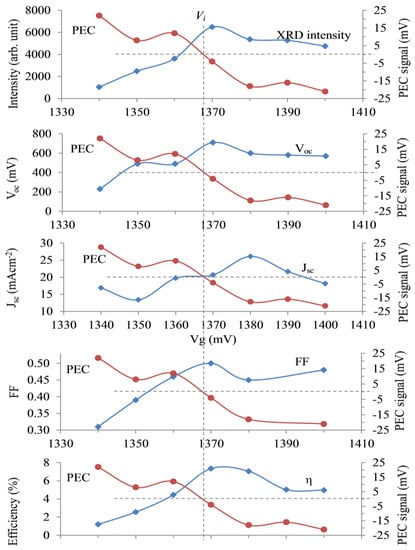 As discussed in Section 2.1, a CdTe electrolyte was prepared, and CdTe layers were grown on glass/FTO substrates at different voltages. PEC measurements were carried out to determine the Vi, the conversion voltage from p-CdTe to n-CdTe. For this particular bath, the Vi was 1368 mV. The PEC curve obtained for the CdCl2-treated layers is presented in all five panels in Figure 8 in red colour. The intensity of the dominant (111) XRD peak shown in the first panel indicates that the highest crystallinity was obtained closer to the Vi on the Cd-rich side. The devices made in an identical way with the Au contacts were measured, and device parameters were plotted separately against Vg in the other four panels. It is clear that both p-CdTe and n-CdTe produced PV-active devices, but the Cd-rich CdTe layers grown at voltages greater than Vi showed superior device parameters. Although the highest efficiency observed for this experiment was ~7%, the results confirmed that the arguments presented in Section 2.5 are valid. The resultant efficiency values depended on various factors, such as the purity of the electrolyte and the processing steps. Repeated experiments showed similar results, confirming the above predictions.