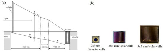 We experimentally tested the device designed on p-type window material [39]. N-type GaAs wafers were used as the substrate, keeping Eg2 at 1.43 eV. Then, the most studied GaAlAs alloy was deposited by metal organic chemical vapour deposition (MOCVD) method, by increasing the Al concentration gradually towards the front of the device. This Al increase was continued until the front layer band gap reached ~2.20 eV (Eg1). The layers close to the GaAs substrate were n-doped with Si, and the Si concentration was gradually reduced towards the middle of the structure. Then, the layers towards the front were gradually grown with p-type doping with carbon. The total thickness of the graded band gap structure was set to ~3.0 µm (see Figure 11a). Solar cells were processed by making ohmic contacts to both the front, and the back n-GaAs substrate. Front contacts were made using grid-type contacts to reduce shading, and three different-sized devices were made as shown in Figure 11b.