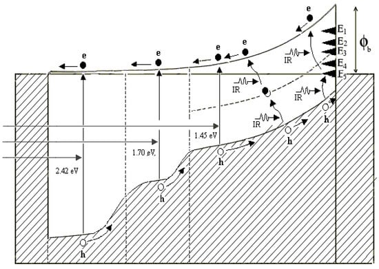 The aim of PV devices is to harvest all photons available, if possible, to achieve high-performing solar cells. The Solar Energy Group at Sheffield Hallam University designed a graded bandgap multilayer solar cell to develop such a device [7,38,39,40]. By expanding the energy band diagram of Figure 7b, the graded band gap structure shown in Figure 10a was designed using n-type window material. Similar devices can be designed on p-type window material, as shown in Figure 10b. The Voc of both these designs depends on the smallest energy band gap (Eg2) used in the device. Therefore, to achieve Voc values above 1.00 V, the Eg2 value should be kept ~1.30 eV. Out of these two designs, the one built on p-type window material has more advantages. Because of the much larger bandgap of the window material (Eg1), the slope of the conduction band can be increased. This means that the internal electric field throughout the device can be kept high for charge carrier separation and collection. The other advantage is for increased impact ionisation. When the electrons created at the front accelerate towards the back contact, the band gap gradually reduces. Therefore, the accelerated electrons gain adequate energy to create e-h pairs in small band gap materials available towards the back of the device.