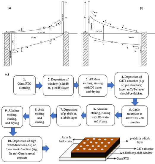 Main features (a,b) and basic fabrication steps (c) required for a good PV active device. Both electrical contacts are ohmic contacts, and any light-absorbing material or device structure can be incorporated so that the slope of the device structure (internal electric field) is strong [42,43].