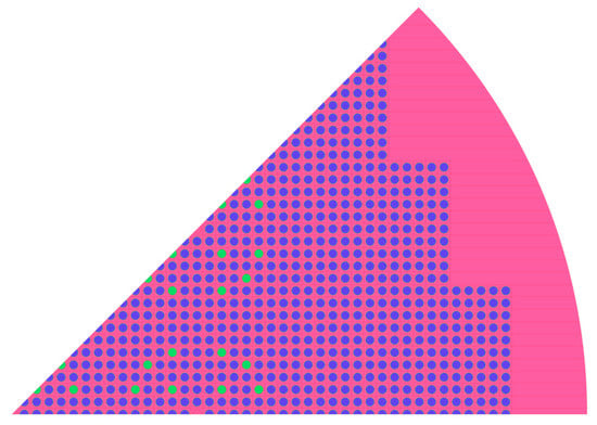 Figure 2. The core’s central region and a 3 × 3 array of PWR (Pressurized Water Reactor) fuel assemblies are very similar, with fuel rods in each fuel assembly arranged in a 15 × 15 lattice. The pitch is 1.6358 cm, and the core diameter is 152.4 cm. The nine assemblies are surrounded by a drive zone consisting of low-enriched uranium fuel rods, which has an irregular boundary. In the entire core of Loading Scheme 8, there are 4808 fuel rods, 9 water holes (located in the center of each fuel assembly), 144 Pyrex rods, no Vicor or Al