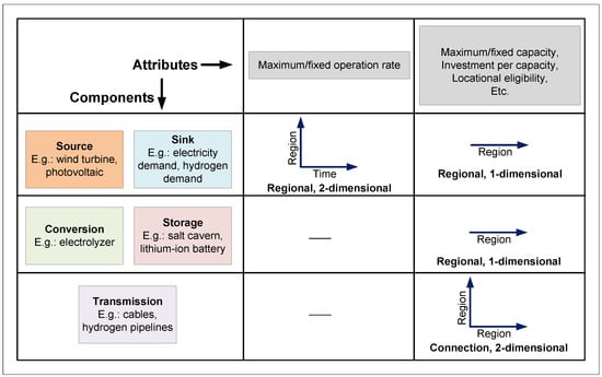 - Connection attributes: These attributes characterize the connections between regions. They are always two-dimensional (region × region). An example of a connection attribute is the capacity of a DC cable between two regions.