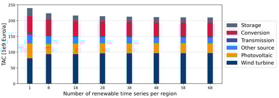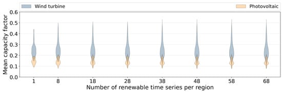 - Temporal scope and resolution: The data of one year are considered. They have an hourly temporal resolution, with 8760 time steps for one year. Prior to optimization, temporal aggregation is performed. The resolution is reduced to 40 typical days with eight segments within each typical day. For this purpose, the method developed by Hoffmann et al. [45] is employed.In order to accurately assess the impact of spatial and technological aggregations on the optimization results, the effects of temporal aggregation should be nullified across all experimental runs. Here, it is accomplished by performing temporal aggregation only for the highest spatial and technological resolution. The resulting temporal clusters are saved and in all the successive runs, the data are temporally aggregated to obtain the same clusters. This ensures that, in each case, the time series are reduced temporally to obtain the same set of typical days, with the same segments in each typical day.
