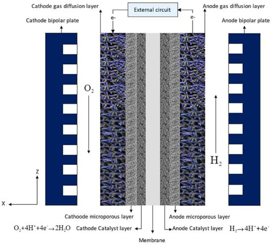 The hydrogen and oxygen/air enter the PEMFC through their corresponding flow channels and they spread through gas diffusion layer (GDL). The hydrogen gas liberates H+ ions at the catalyst site of the anode, which are permitted to pass through the proton exchange membrane electrolyte to the cathode domain. The electrons which are released during the formation of the protons from hydrogen are taken into the external circuit which results in the flow of electric current. The various components of the PEMFC are shown in Figure 1. The protons available at the cathode side combine with the electrons from the external circuit and O2 to form water. The product, water, is then expelled from the fuel cell exhaust via the cathode flow channel. The efficiency of a PEMFC is greatly dependent on the conductivity of the proton through the membrane electrolyte. The membrane should be optimally hydrated for efficient transfer of protons, whilst not over saturating and flooding the fuel cell; thus, water management of the electrolyte becomes crucial to maximising performance [].