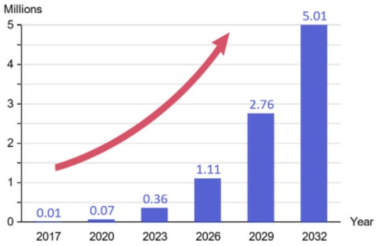 Fuel cell electric vehicles (FCEVs) are being developed by many automotive manufacturers, with Hyundai, Honda and Toyota among the most well-known and technologically sophisticated. Pre-series quantities of cars and buses are being manufactured and are already on the market []. By 2032, it is anticipated that more than 5 million FCEVs would have been sold on the market, as depicted in Figure 2. In contrast, about 3 million electric vehicles were sold worldwide in 2020 [].