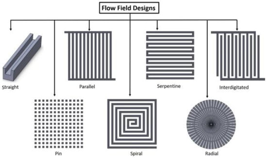 Designs for the flow fields in PEMFCs include single straight, parallel, serpentine, interdigitated, pin, spiral, cylindrical, radial, natural inspired, square tubular and fractal. Figure 5 displays the most common PEMFC flow field configurations []. The flow field’s design has a significant impact on the performance of a PEMFC, which has led to several changes to enhance its performance. In this article, the performance of PEMFC is examined in relation to various conventional flow field designs, modified flow field designs, hybrid flow field designs and new flow field designs.