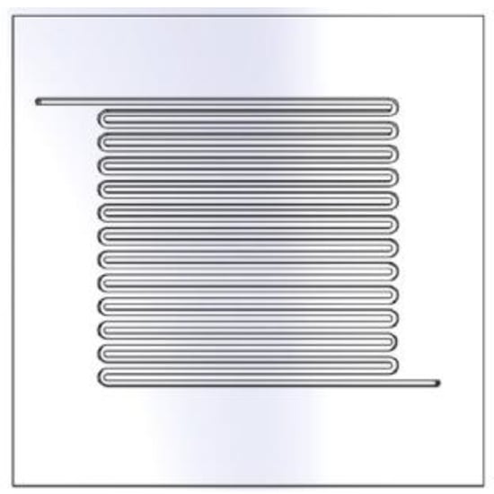 The majority of industrial and automotive applications employ the serpentine flow channel []. This is due to the improved reactant and oxidizer distribution that the serpentine flow channel can demonstrate at the anode side and cathode side GDLs, respectively. However, the disadvantage of the serpentine flow field configuration is that, in comparison to parallel flow channels, the pressure loss across it is significantly larger []. A basic serpentine flow field design is depicted in Figure 6.