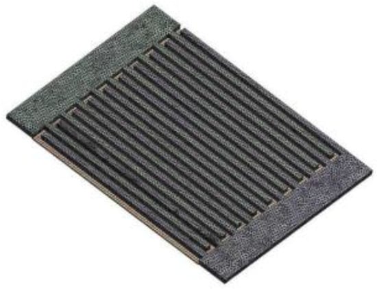 The interdigitated flow field channel was initially suggested by Nguyen [] to improve the transfer of liquid water out of the gas diffusion layer. Reactant is forced from the channel to the GDL through a convection process in an interdigitated flow channel, resulting in improved reactant transportation and water removal []. Hu et al. [] assessed how the interdigitated flow field design affected PEMFC performance. According to their findings, the interdigitated cathode side in the flow field design reduced the liquid water content and increased the oxygen concentration in the gas diffusion layer when compared to straight flow. The interdigitated design is advantageous because it increases reaction activity and improves the performance of the cell, according to Yi et al. [], who studied the impact of various flow channel designs on the performance of PEM fuel cells. In contrast to diffusion, the convection process is far more effective in overcoming the water flooding effect, and as a result, interdigitated PEMFCs function better than straight-channel PEMFCs. According to Manso et al. [], a drawback of the interdigitated flow field configuration is the higher consumption of energy to pump the gas, which raises the power requirement to feed the reactants in their respective flow channels and thus lowers efficiency at the system level. A basic interdigitated flow field design configuration is presented in Figure 7.