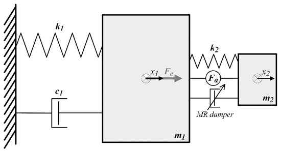 A scaled wind turbine tower-nacelle model is regarded as a protected structure whose first bending mode modal parameters are: mass m1, stiffness k1, and damping c1. An H-MR-TVA of absorber mass m2 and spring stiffness k2 is considered (Figure 1). The movement of both m1 and m2 was constrained to be linear displacement x1 and x2 (accordingly) along the common axis (horizontal in Figure 1) of an applied excitation force , modelling the resultant load applied to the nacelle. An MR damper and a force actuator () were both built parallel to the spring. Although the force actuator was carefully selected to exhibit the lowest motion damping for the required output nominal force , its influence (excess damping) on the TVA operation was significant; thus, mass m2 was increased with regard to the previous research [41] to 14.1% of the mass m1 to obtain two local maxima of the primary system displacement (x1) frequency response (see Section 7) [19], while stiffness k2 was tuned accordingly. Both the MR damper and force actuator were used for control purposes. The values of the adopted system parameters are presented in Table 1.