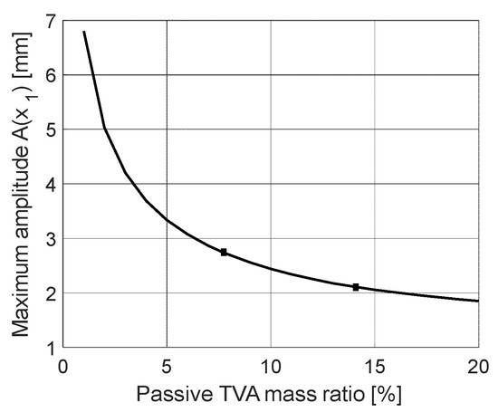 Figure 2 presents the diagram of the theoretical passive TVA efficiency (vs. mass ratio, i.e., m2/m1), according to the authors of [19], represented by maximum nacelle displacement amplitudes ) for the regarded primary structure parameters (Table 1); states for the amplitude. Two dots indicate mass ratios assumed in the current (14.1%) vs. previous research (7.7%) [41]. As it is commonly known, the TVA efficiency characteristic is nonlinear. The reduction in ) due to the mass ratio increase to 14.1% was expected to be 23% only (concerning TVA of 7.7% mass ratio). However, a larger mass ratio contributes to lower TVA sensitivity to detuning [55].
