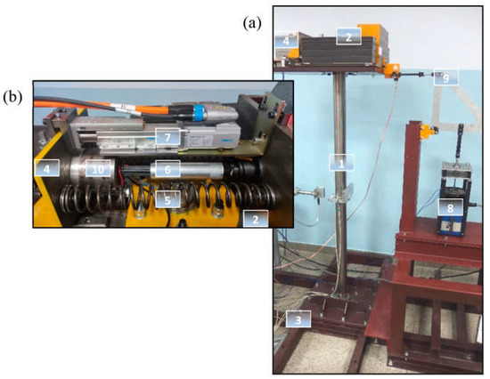 The test rig (Figure 4) consisted of a vertically oriented Ti-Gr5 circular rod (no. 1, modelling the wind turbine tower) and a complex of steel plates (no. 2, modelling the nacelle unit, including the turbine) fastened to the top of the rod, with the H-MR-TVA system built-in. The Ti-Gr5 rod was fixed to a section steel foundation frame (no. 3). The H-MR-TVA (no. 4) consisted of an additional mass moving horizontally along linear bearing guides, joined to the nacelle-unit (no. 2) via springs (no. 5), Lord RD-1097-1 MR damper (no. 6) [45], and Festo EGSC-BS-KF-32-50-8P mini slide actuator of linear stroke (powered by Festo EMME-AS-40-S-LV-AS servo motor) (no. 7) [58] in parallel. The H-MR-TVA operated along the same direction as the force excitation applied. The structure was excited by the TMS2060E modal shaker (no. 8 [59]), whose force was transferred to the nacelle-unit (no. 2) with the use of the drive train system (no. 9) of the changeable leverage.