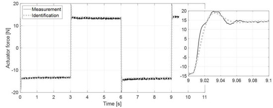 The electric drive N step response series was gathered (Figure 5) using the locked (with 0.9 A control current) MR damper, built-in parallel, and its force sensor (no. 10, Figure 4). The response was identified with a time-delayed transfer Function (21) of three poles and two zeros from MATLAB System Identification App (fit to estimation data 96%, data prefiltered, stability enforced):