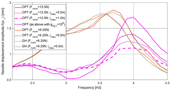 Nacelle horizontal displacement amplitude ) frequency characteristics: OPT for different control parameter values vs. GH for .