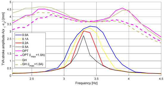 The combined electric drive and MR damper operation in the H-MR-TVA system (control case I, baseline configuration), i.e., with , led to a 35% maximum ) reduction in relation to the H-MR-TVA operation without MR damper semi-active support (i.e., with and 52% reduction with regard to the previous research with an MR-TVA system of a lower (7.7%) mass ratio, but less TVA excess damping [41]. This is regarded as a satisfactory result for such a real-time implementation, considering the nonlinearity of Figure 2 characteristics and the expected 23% ) reduction only (Section 2). Both GH and OPT (control case I, baseline configuration) provided maximum ) values close to 1.1 mm (i.e., 57% reduction concerning the 0.0 A passive configuration exhibiting the lowest ) values, and 87% reduction regarding the 0.5 A passive configuration, see Figure 6). This result was obtained at ca. 4 mm TVA stroke amplitude (OPT configuration, Figure 9), ca. 32 N maximum MR damper force (Figure 12), and ca. 0.76 W maximum actuator power (Figure 15). The configurations without the MR damper semi-active support were characterised by more than 4.5 mm TVA stroke amplitude, only 4 N maximum MR damper force, and as much as 0.95 W maximum actuator power, while being significantly less efficient in primary structure deflection minimisation.