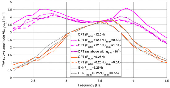 The TVA stroke amplitude ) frequency characteristics: OPT for different control parameter values vs. GH for .