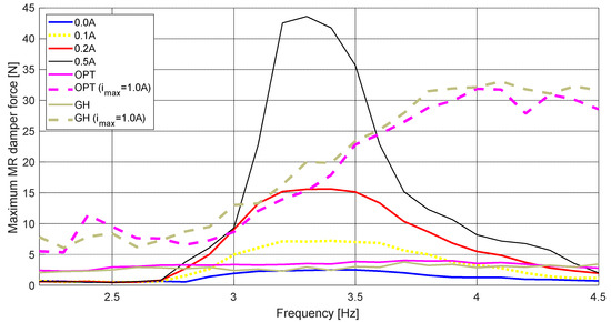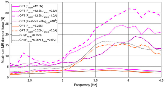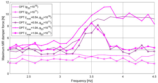 The maximum MR damper force frequency characteristics: OPT for different and values, and .