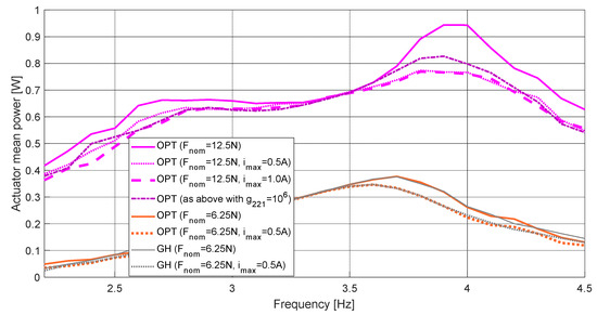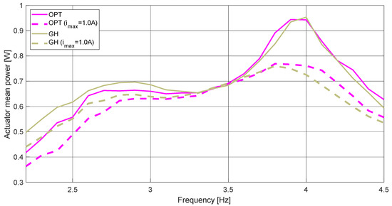 The mean actuator power frequency characteristics: OPT for vs. GH for .