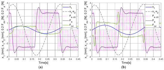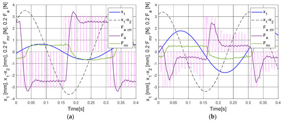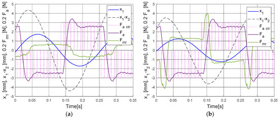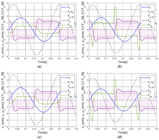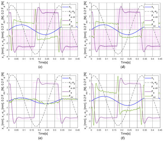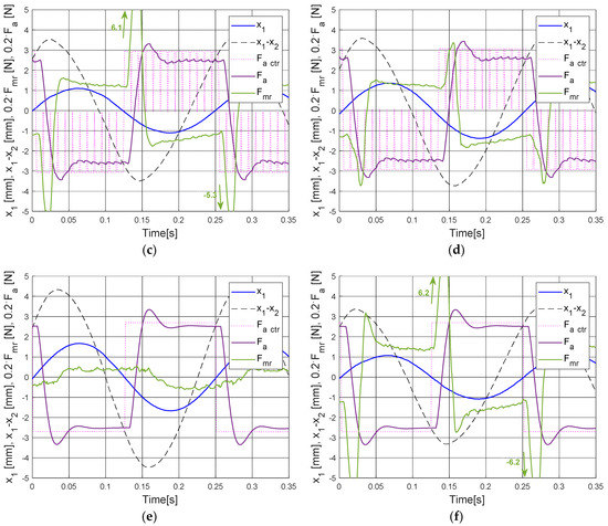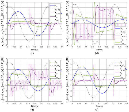 For higher actuator force solutions (as the former), the MR damper semi-active support with millisecond response time was greatly beneficial due to the substantial actuator response time delay related to the oscillation period at frequencies above 3.6 Hz (see Figure 5, Figure 6 and Figure 19). On the other hand, it may also be observed that the electric actuator cancelled the unwanted MR damper remanent force, as assumed previously—see Figure 17, Figure 18, Figure 19 and Figure 20a,b,d.