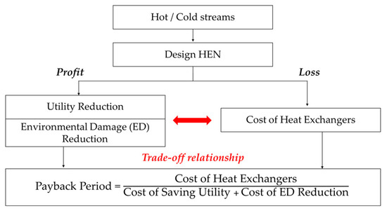 The HEN, in which the waste energy from the hot and cold streams is used for the construction of heat exchangers instead of using utilities (steam, cooling water, etc.), is one method of increasing the efficiency of energy consumption in the NC process. Essentially, heat exchangers are used to transport heat energy. Heat exchange occurs because of the complementary effect of energy exchange between a hot stream that has to be cooled down and a cold stream that has to be heated up. With increasing use of waste energy, utility savings increase, but the cost of the heat exchangers also increases. Therefore, the utility savings are considered revenue, while the heat exchanger cost represents the loss. The revenue from utility reduction stands in a trade-off relationship with the cost of the heat exchangers when the assessment model referred to as the payback period is used [20] (Figure 1).