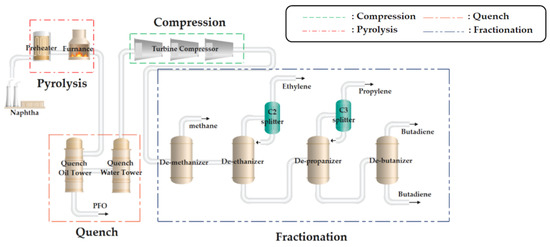 NC is implemented in four steps: (1) pyrolysis, (2) quenching, (3) compression, and (4) fractionation. Its flow diagram is shown in Figure 2.