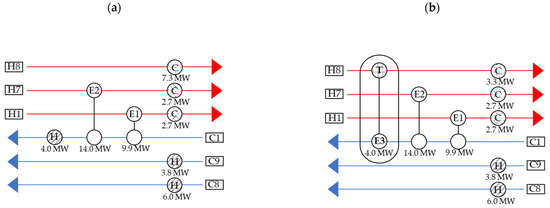 There are two thermodynamic regions of the composite curve: one of these is “above the pinch point”, and is characterized by energy shortage, requiring only the hot utility; the other is “below the pinch point”, and has an excess of energy, requiring only the cold utility. Heat exchangers are added to cover this heat differential without the need for any utilities originating from outside the process. However, there are some restrictions when performing pinch analysis: (1) heat exchangers are not able to cross the pinch point; (2) the temperature of the hot utility should be lower than the pinch-point gap; and (3) the components of the hot utility should be steam [26,27]. The reason for the first restriction is that if a heat exchanger crosses the pinch point, the energy consumption will be higher than the minimum requirement. The second restriction is that heat exchange does not occur if the temperature gap between the hot and cold streams is greater than the pinch-point gap. The third restriction, whereby the utility that is to be replaced is steam, is necessary because it is more expensive than other utilities and can be discarded more easily than other streams, which can be used as utilities in the process.